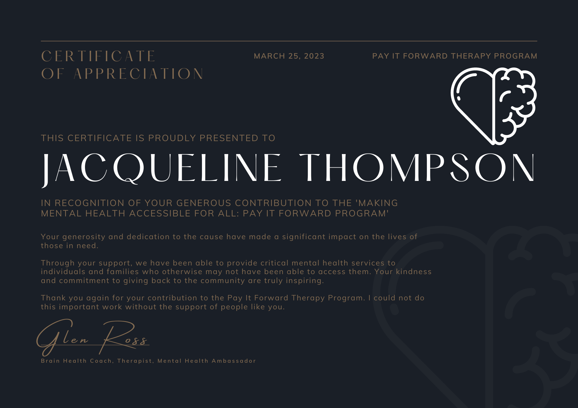 I believe in the importance of mental health and am committed to providing support and resources to individuals who may not have access to them otherwise. In an effort to make a positive impact, I have created a Pay It Forward Therapy Donation Program.