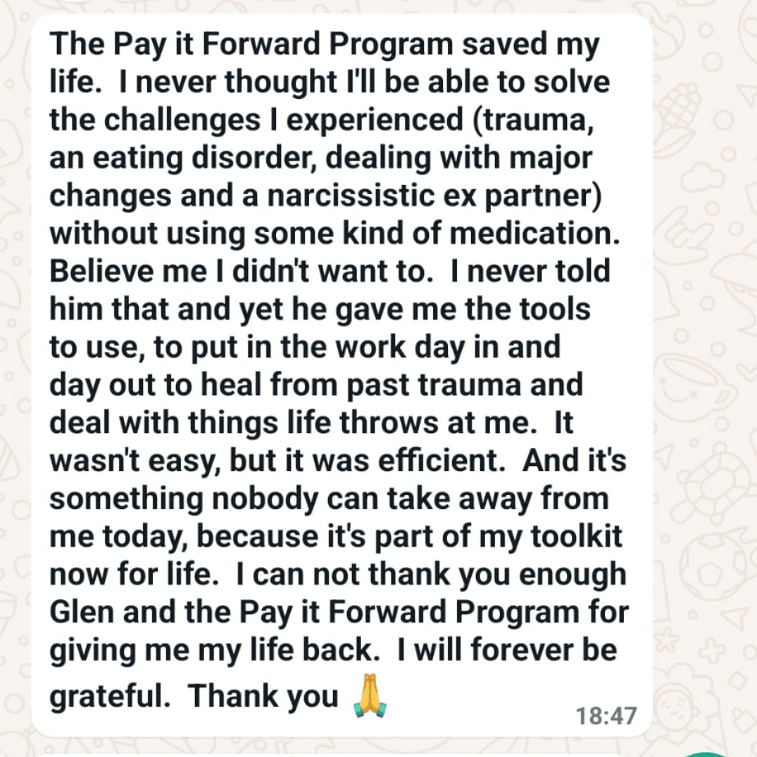 If you are interested in participating in the Pay It Forward Donation Program, please send an email to glen@glenross.coach explaining your financial situation and why access to mental health services is important to you.