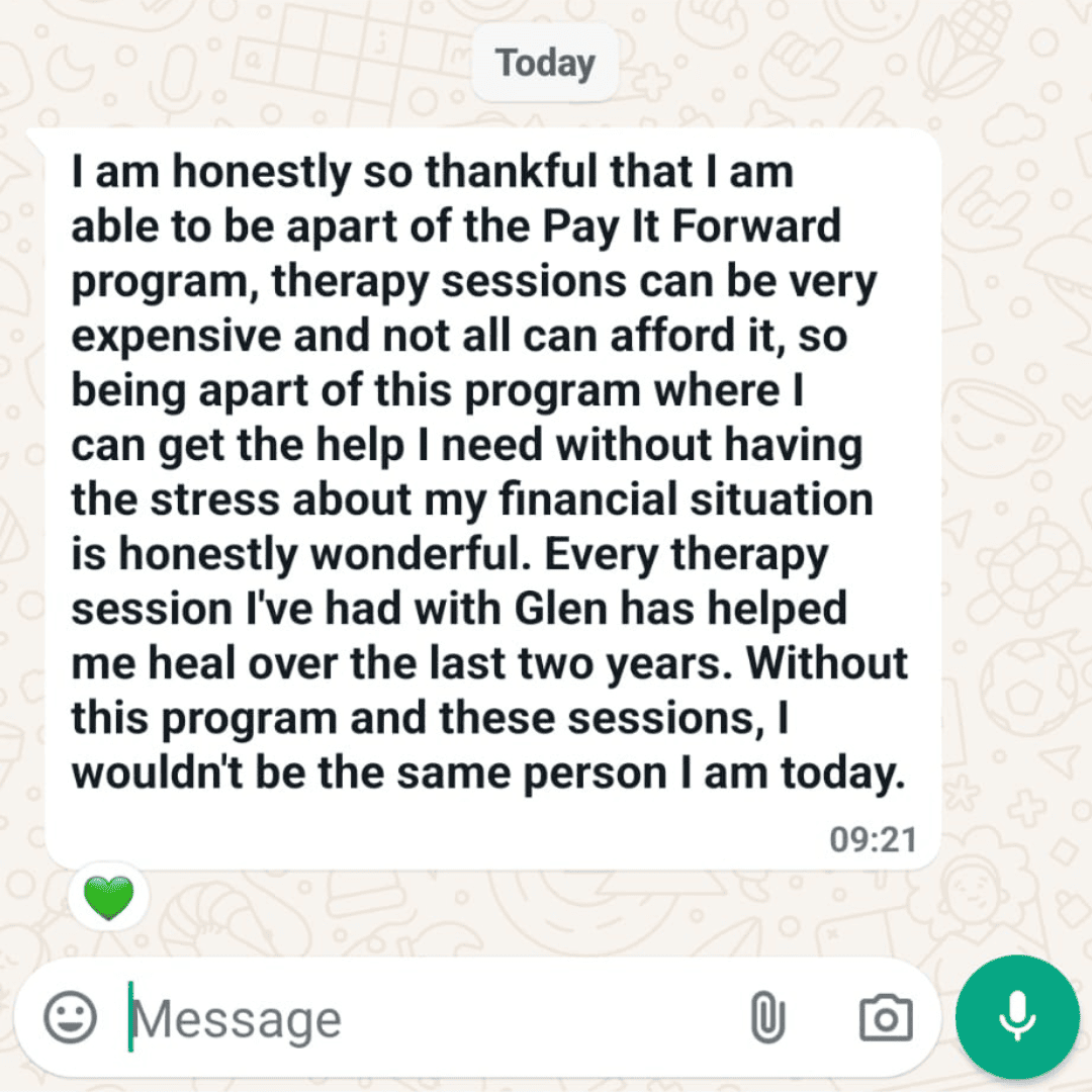 I believe that access to mental health support should be available to everyone, regardless of their financial situation. That's why I've started the Pay It Forward Therapy Program, to help make mental health services accessible to those who may not have the means to access them otherwise.